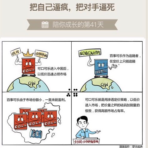 可口可乐进入中国后,也一直采用渗透定价法,以相对的低价格迅速占领市场。后来百事可乐公司也进入中国,但是作为市场追随者,他们在定价上只能跟随。但由于市场份额小,还需要投入很多宣传吸引消费者,所以百事可乐在进入中国后的十几年,一直没能盈利。这就是可口可乐的“渗透定价”策略。