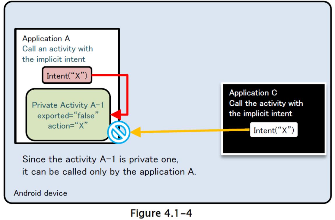 不应该使用未定义的意图过滤器和导出属性false的原因,是 Android 的行为存在漏洞,并且由于意图过滤器的工作原理,其他应用的活动可能会意外调用它。下面的两个图展示了这个解释。图 4.1-4 是一个正常行为的例子,其中私有活动(应用 A)只能由同一个应用的隐式Intent调用。 意图过滤器(action ="X")被定义为仅在应用 A 内部工作,所以这是预期的行为。