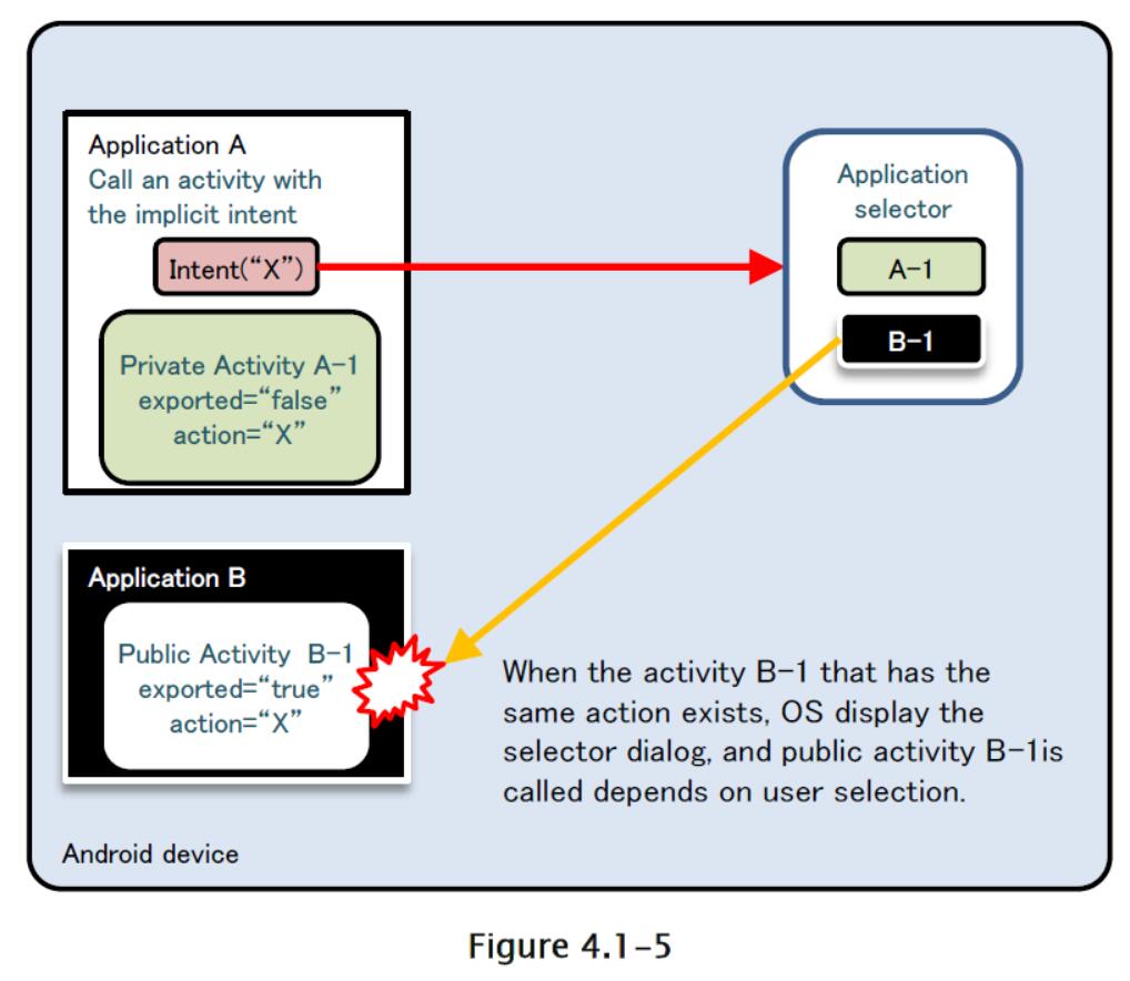 下面的图 4.1-5 展示了一个场景,其中在应用 B 和应用 A 中定义了相同的意图过滤器(action ="X")。应用 A 试图通过发送隐式意图,来调用同一应用中的私有活动 ,但是这次显示了对话框,询问用户选择哪个应用,以及应用 B 中的公共活动 B-1 ,由于用户的选择而错误调用。 由于这个漏洞,可能会将敏感信息发送到其他应用,或者应用可能会收到意外的返回值。