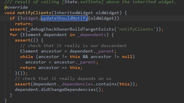 最后,如下图所示,在 InheritedElement 中,notifyClients 通过 InheritedWidget 的 updateShouldNotify 方法判断是否更新,比如在 Theme的 _InheritedTheme 是: