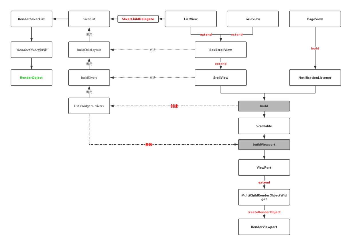 并且从 RenderViewport的说明我们知道,RenderViewport内部是不能直接放置 RenderBox,需要通过 RenderSliver 大家族来完成布局。而从源码可知:RenderViewport 对应的 Widget Viewport 就是一个 MultiChildRenderObjectWidget。 (你看,又回到 MultiChildRenderObjectWidget 了吧。)