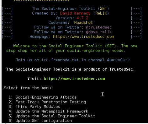 se-toolkit完成之后,你会看到 SET 菜单。SET 菜单有如下选项: