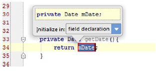 把光标放到Date(粗体高亮)上并按键Ctrl+Alt+F | Cmd+Alt+F。你将看到一个对话框如图4-10所示。在Android里,按惯例域(a.k.a. 成员变量)名的头字母用m。你将会注意到一个下拉菜单允许你初始化当前方法中的域,域声明,或构造器。选择域声明并按回车。