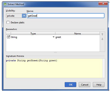 象我们已经提到过的,任何时候你发现重复一个代码块或复制和粘贴代码块,你就必须考虑析出方法了。选择清单4-1中粗体高亮的块。现在按Ctrl+Alt+M | Cmd+Alt+M析出方法。将呈现一个对话框列出方法的签名。重命名这个方法为getGreet,如图4-11所示,接着点击OK。