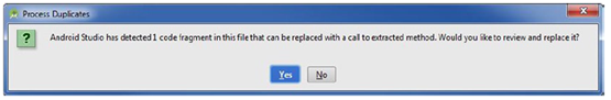 Android Studio扫描你的文件并看到你有另外一个确凿的代码块案例。在处理复制对话框里点击Yes接受建议,如图4-12所示。