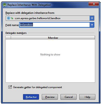 进一步分析后,我们决定Patio不是一个Sandbox,但更象是它拥有一个Sandbox。为了改变它们的关系,导航到Refactor ➤ Replace Inheritance with Delegation。在结果对话框里,点击为委托成产生getter方法,如图4-14所示。