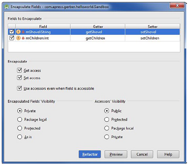 结果对话框允许你精确地选择怎样封装这些域以及它们的访问级别。真正地封装域将有一个私有的可视度及公有的访问(getter)及改变(setter)方法。点击Refactor按钮,如图4-15所示,注意到Android Studio在我们的Sandbox.java类里为我们生成所有的getter和setter。