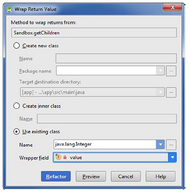 当你需要返回一个对象而不是基本数据类型时,包装返回值可能是有用的(当然还有其他的情形你可能想包装一个返回值)。把光标放到getChildren()方法上并导航到Refactor ➤ Wrap Method Return Value。选择Use Existing Class选项,名称框输入java.lang.Integer,包装域框则选择value,如图4-16所示。现在点击Refactor按钮且注意到你的getChildren()方法返回一个Integer类,而不是基本数据类型int。