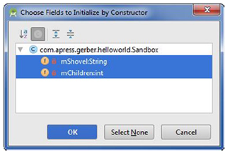 把光标放在Sandbox类定义附栏内。按Alt+Insert | Cmd+N接着选择生成一个新构造器。选择所有成员变量,如图4-17所示,然后点击OK。