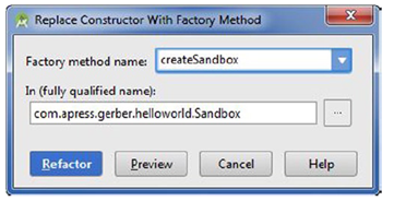 将光标放到如下所示代码片段构造器的任何位置,并导航到Refactor ➤ Replace Constructor with Factory Method。结果对话框象图4-18所示。点击Refactor来生成一个工厂方法。