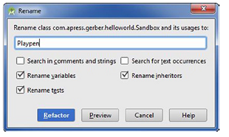 在Project tool窗口中选择Sandbox并导航到Refactor➤ Rename或按Shift+F6.引出一个对话框以允许你重命名你的类,另外也可以重命名出现在注释中,测试实例,以及继承类中的那些名字。重命名Sandbox为Playpen并点击Refactor按钮,如图4-2所示。你将看到在你项目中重命名的操作。现在请用Ctrl+Z | Cmd+Z取消这个操作。