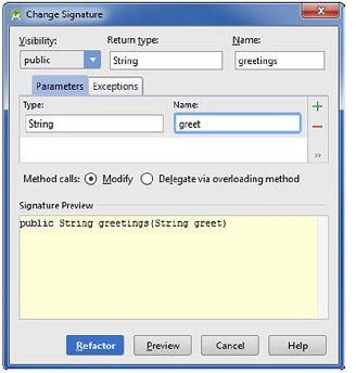 将光标移到单词greetings上面(高亮的粗体字)并按Ctrl+F6 |Cmd+F6,或导航到Refactor ➤ Change Signature。结果对话框会允许你修改方法的签名,如图4-3所示。
