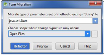 更改java.lang.String到java.util.Date,如图4-4所示。从选择范围框的下拉菜单里选择打开文件。如同大多数重构操作,通过点击预览按钮,你可预览你的更改。这里我们按Refactor按钮。