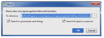 右键点击(在Mac电脑上Ctrl-click)com.apress.gerber.helloworld包并选择New ➤ Package。给这个重构目标包命名。从Project tool窗口,把sandbox.java拖放到重构目标包里,当出现图4-5对话框时按OK。在Project tool窗口中执行的任何拖放操作将自动产生一个重构移动操作,这个会让你安全地把一个类从一个包移动到别一个包里。
