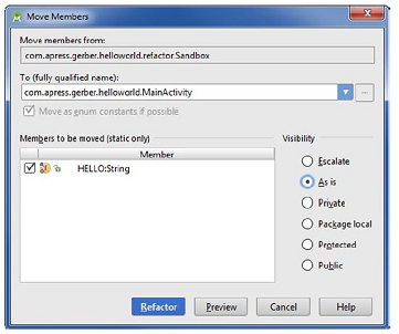在这章里描述的许多重构操作也可不用Android Studio的重构工具来执行。无论怎样,你必须避免强行重构(例如:通过一个全文的查找/替换操作来重组代码),因为在这些情形下Android Studio不能从引入的错误中一直保护你。相反,如果Android Studio发现你企图一个重构操作,它将尽力避免你犯任何愚蠢错误。例如,在Project tool窗口中拖动一个JAVA源文件从一个包到另一个包,这将强制产Refactor ➤ Move操作,由此会分析你的移动操作结果,允许你预览那些改变,然后适当地改变类中所有的import语句以适应合格的新全包名。