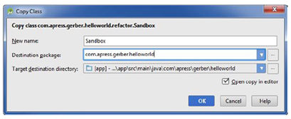 复制,有点象移动,按快捷键F5或选择主菜单里的Refactor ➤ Copy来访问。在Project tool窗口,选择之前重构的包中的Sandbox.java并按下F5键。在目标包的拖放菜单中选择com.apress.gerber.helloworld包并点击OK,如图4-7所示。象我们这里无差别地复制JAVA源文件不是一个好主意,因为结果不明确且普通存在着错误。