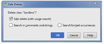 让我们来删除刚才复制的类。在Android Studio的Project tool窗口里用Delete按键,你总可以删除文件和资源。在刚才重构包中点击Sandbox.java文件并按下Delete键。结果对话框允许你使用安全删检查选项来删除。安全删除的先进之处在于执行删除前我们可查询任何因依赖于这个资产而可能导致的破坏,如图4-8所示。如果在这个项目中发任何东西依赖于这个资产,将给出一个可选项浏览它们,或点击无论如何都删除可选项来强制删除。