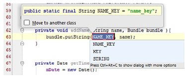 定义一个方法象如下的代码片段。把光标放到name_key字符串上并按Ctrl+Alt+C | Cmd+Alt+C。结果对话框将如图4-9所示。这里,Android Studio提供一些建议的名称。按惯例,常量在JAVA里都应该是大写的。选择NAME_KEY并按回车。