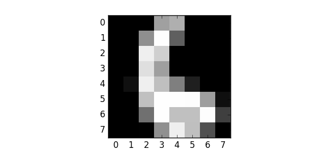 第三行使用数据来训练模型。 在这一行(这是该代码的大部分“工作”)中,调整 SVM 模型的内部状态来拟合训练数据。 我们还传递digits.data,因为这是一个展开的数组,是该算法的可接受输入。