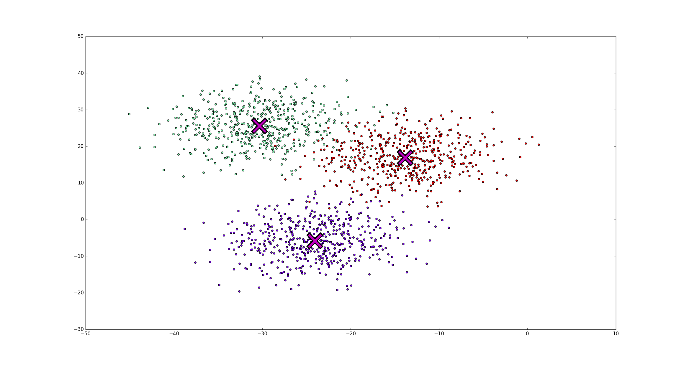 这里的主要变化是我们为这些初始质心创建变量,并在会话中计算其值。 然后,我们将初始猜测绘制到plot_cluster,而不是用于生成数据的实际质心。