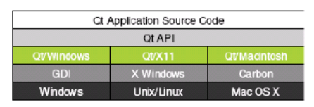 Qt 在它所支持的不同平台中使用底层 API。这与传统的“分层”跨平台工具套件不 同,传统工具套件是指在单个平台工具套件中使用的简单封装(例如,在 Windows 中使用 MFC;在 X11 中使用 Motif)。通常,分层工具套件速度较慢,其原因在于:库函数的每次 调用都会产生许多要经过不同 API 层的附加调用。分层工具套件往往会受到基本工具套件 的功能和行为的限制,导致应用程序中出现隐性错误。