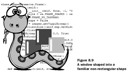 6、这儿有一对不同的框架子类,它们允许不同的外观。类wx.MDIParentFrame可以被用来创建MDI,而wx.MiniFrame可以创建一个带有较小标题栏的工具框样式的窗口。使用SetShape()方法,框架可以呈现出非矩形的形状。形状的区域可以被任何位图定义,并使用简单的颜色掩码来决定区域的边缘。非矩形窗口通常没有标准的标题栏,标题栏使得框架可以被拖动, 但这可以通过显式地处理鼠标事件来管理。